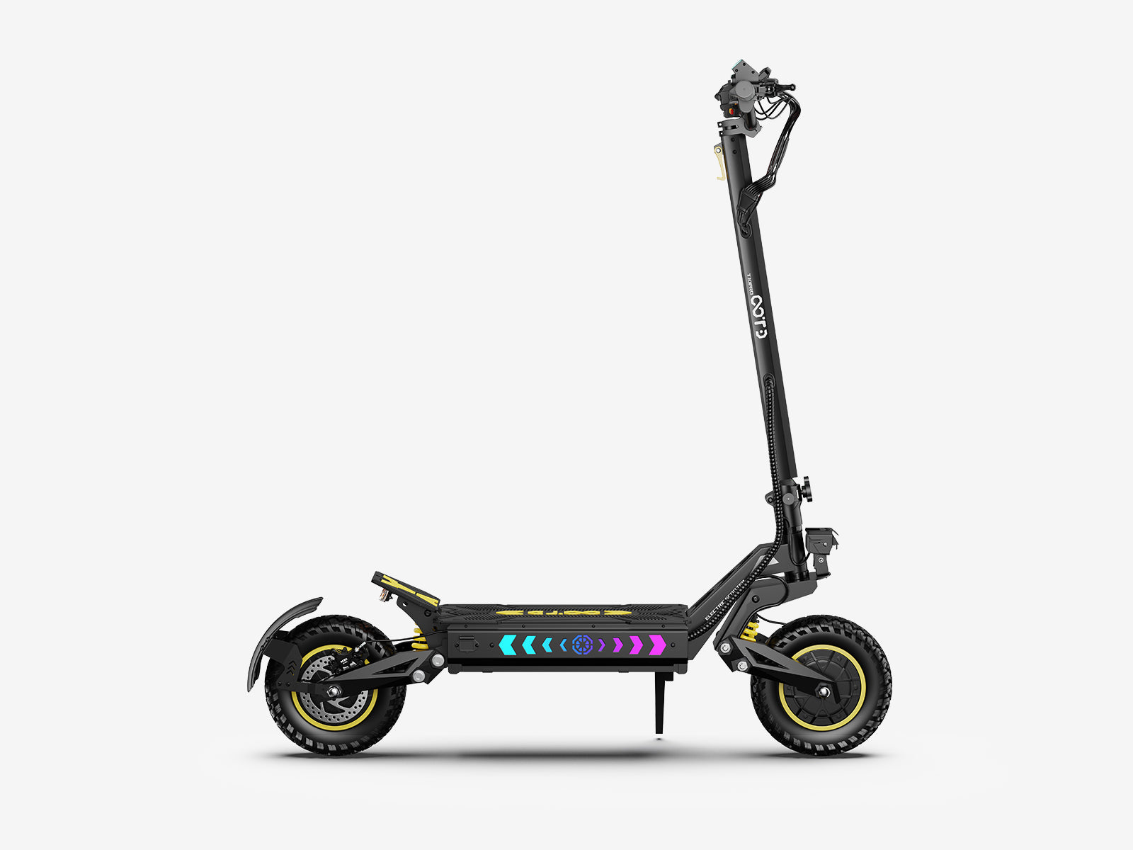 La OOTD T10 Pro est une trottinette electrique haut de gamme : double moteur 800W (2600W en pic), batterie 52V 23.4Ah, jusqu'a 65 km/h en mode debride et 70 km d'autonomie. Pneus 11" tout-terrain, freins hydrauliques 140mm, double suspension avant et arriere. Elle avale la route comme les chemins.